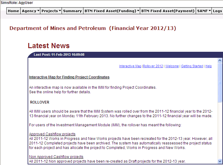 This screen shows what agency you are currently viewing, any news items on the IMM notice board, and a list of agencies that currently have active adjustments for which the user has access to.