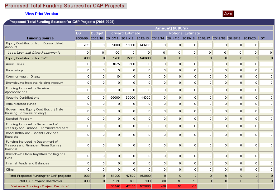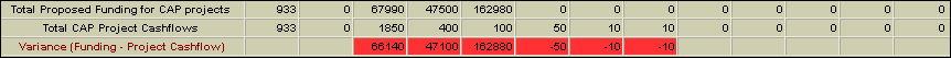 The variance between the Total Proposed Funding for CAP Projects and selected draft project cashflows should be zero at the time for Ministerial signoff. Any variation will be highlighted at the bottom of the Funding table as shown in the image below.