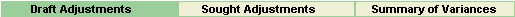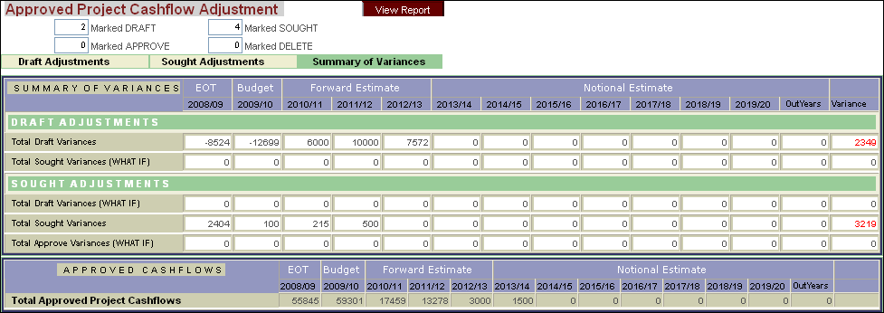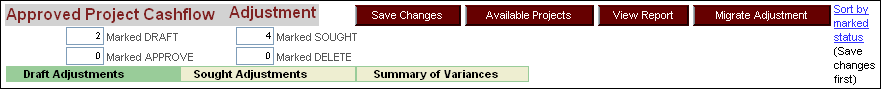 The first tab is 'Draft Adjustments' and includes all adjustments saved as 'Draft' while the second tab 'Sought Adjustments' contains all data on adjustments submitted and saved as 'Sought' and the final tab 'Summary of Variances' displays the total variances for each status of cashflow adjustment.