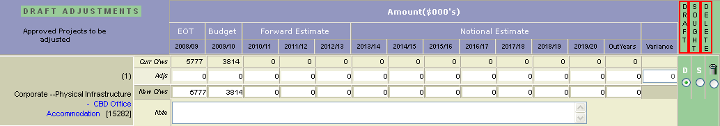 A cashflow adjustment that is in the 'Draft Adjustment' screen can be labelled through the status selection box as Deleted, Draft or Sought. A cashflow adjustment that has been submitted to the 'Sought Adjustment' screen can be labelled through the status selection box as Draft, Sought, Approved or Deleted.